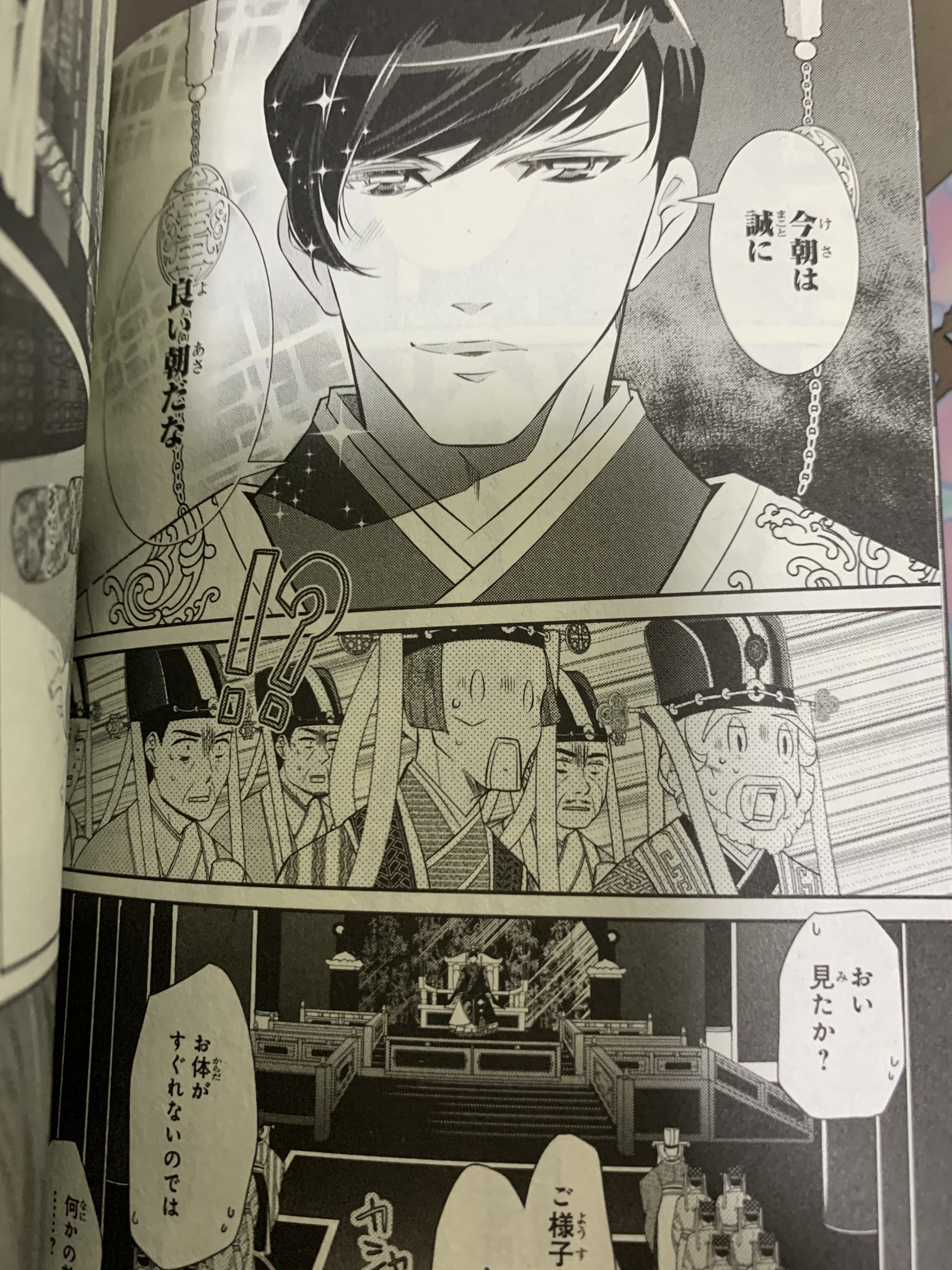 小玉と結ばれた日の翌朝、文林は臣下へ、「誠に良い朝だな」とあいさつし、いつもとは違うあまりの艶々した笑顔に、体調がすぐれないのでは?などと心配されてしまいます。